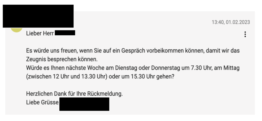 Mehrere Tage sind vergangen und wir hören nichts. Mein Herzschlag hat sich nun komplett beruhigt und ich sehe einem allfälligen Gespräch gelassen entgegen. Und da kommt dann auch die Antwort: